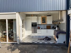 In de achtergevel een nieuw kozijn met deur geplaatst.
